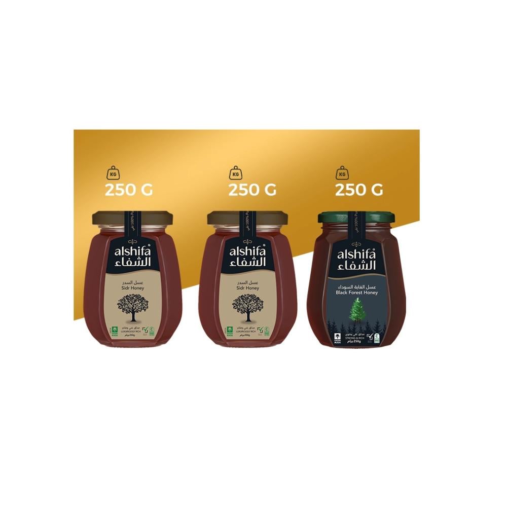 The Premium Bundle (250g) features two luxurious varieties: Sidr Honey and Black Forest Honey — with natural flavors and high nutritional value, offering a truly unique experience for genuine honey enthusiasts.